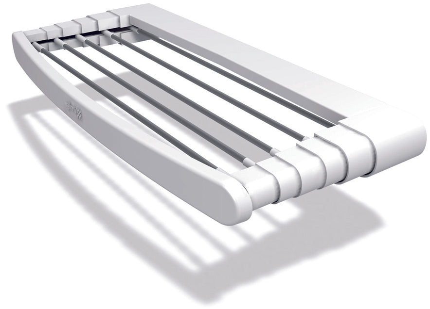 Struttura in resina, fili grossi antipiega in alluminio. Da chiuso diventa mensola e portasciugamani. Stenditura 5 mt.
