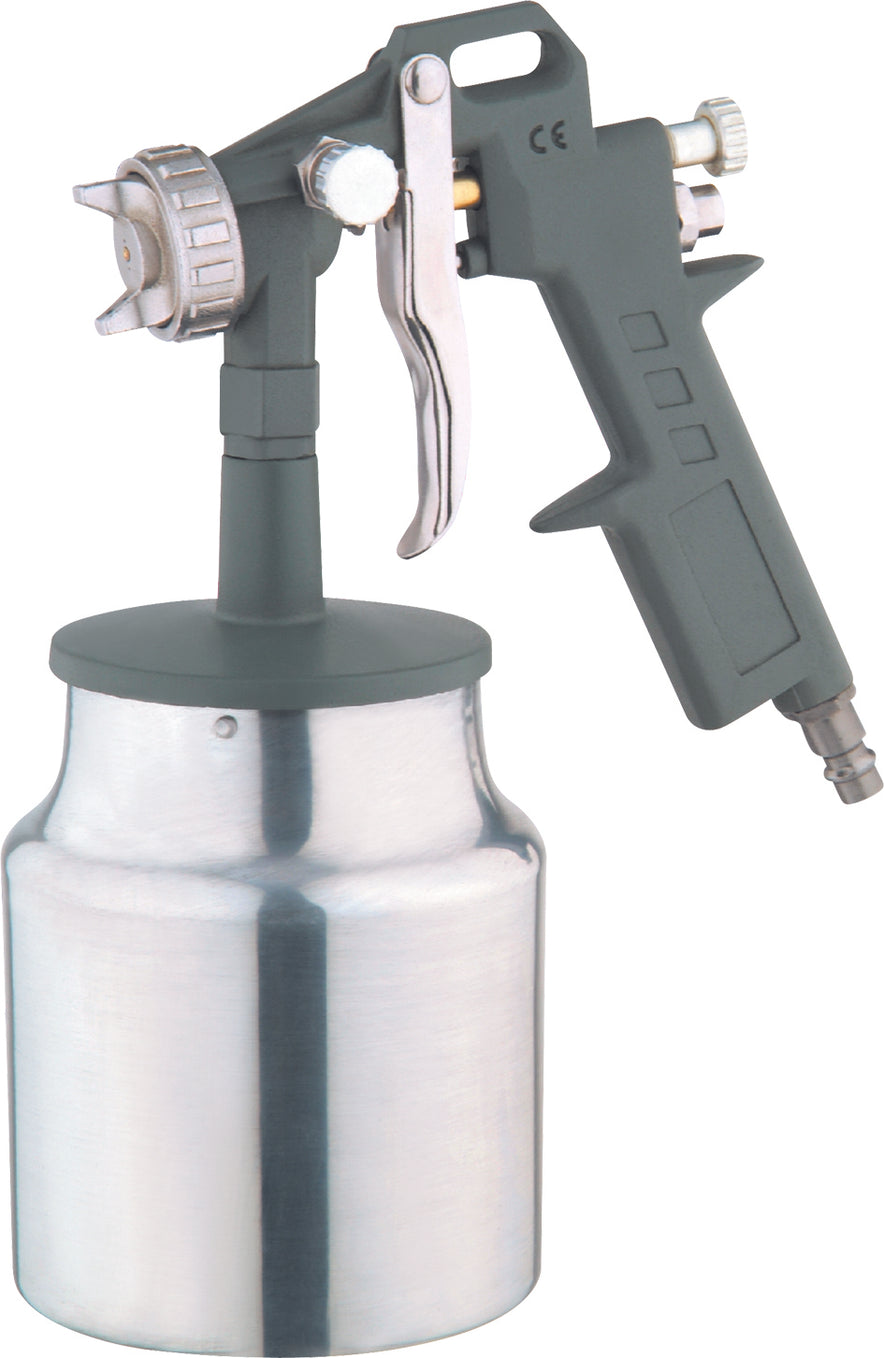 Con serbatoio inferiore in alluminio da ml. 1.000, pressione max 4 bar, consumo d’aria 160 lt/min, getto regolabile a rosa e ventaglio, ugello Ø mm. 1,5.
