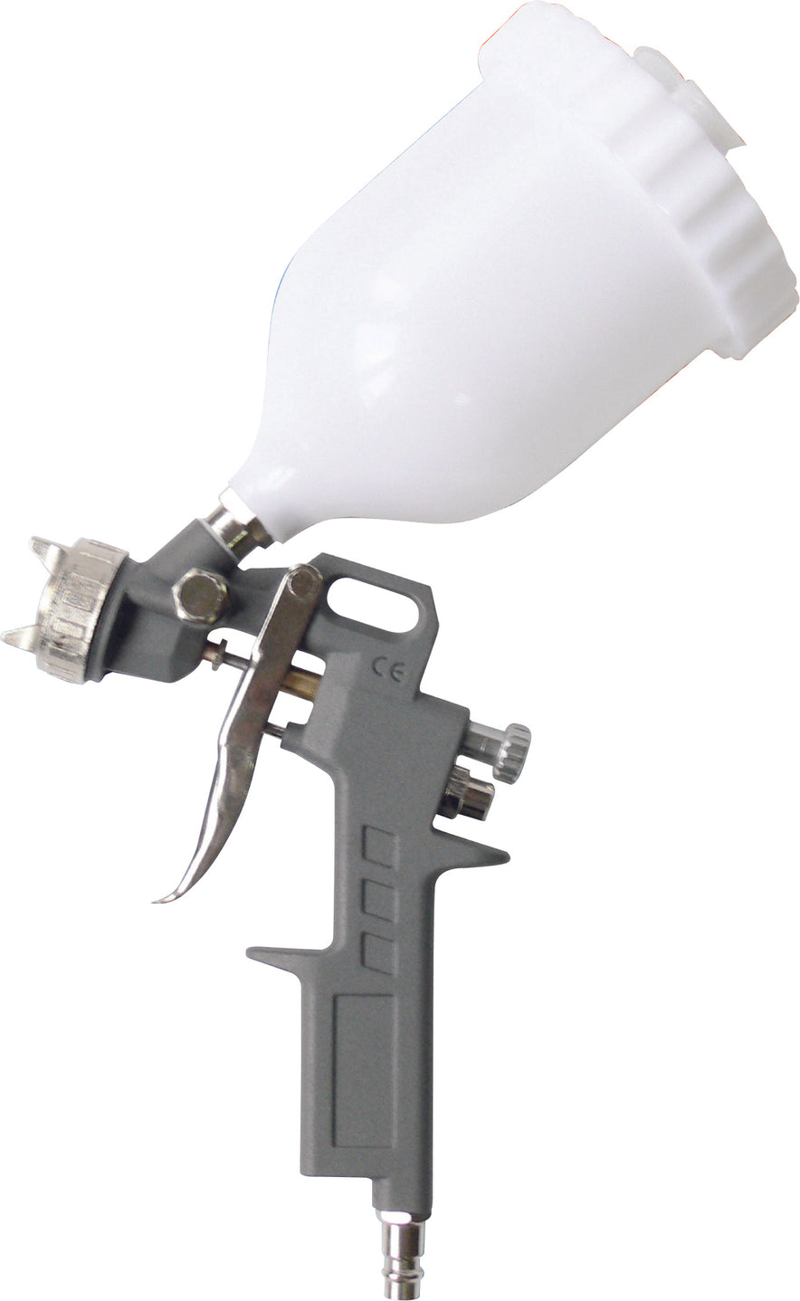 Con serbatoio superiore da ml. 600, pressione max 4 bar, consumo d’aria 160 lt/min, getto regolabile a rosa e ventaglio, ugello Ø mm. 1,5.