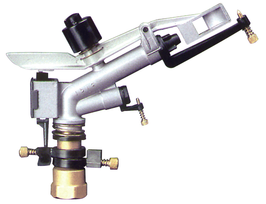 In ottone e polipropilene, 2 getti, ugelli intercambiabili Ø mm. 6÷10, gittata max mt. 23, superficie max irrigata mq. 1.660.