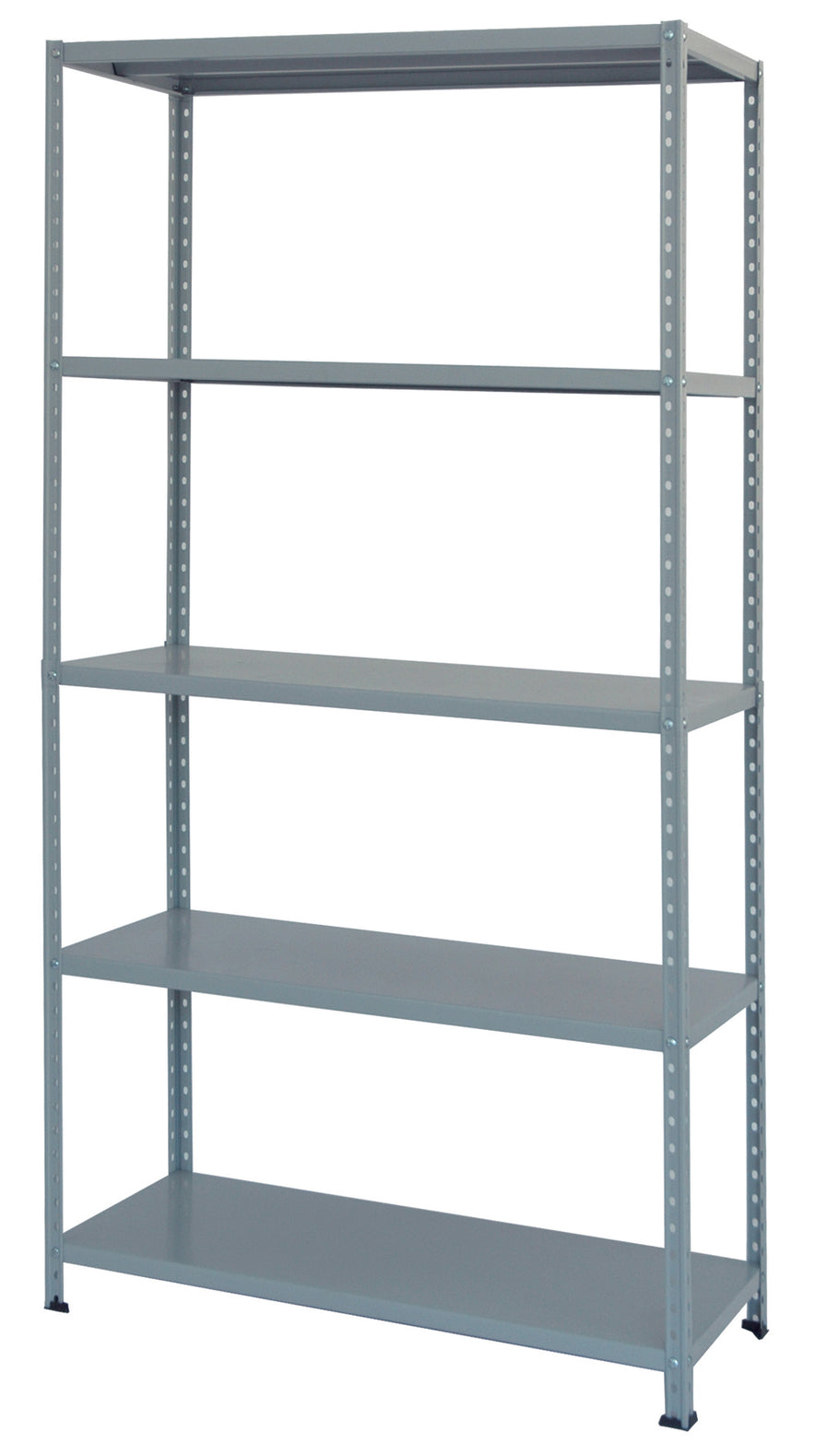 In lamiera verniciata, con rinforzo. 5 ripiani, completo di angolari, bulloni e piedini, col. grigio.