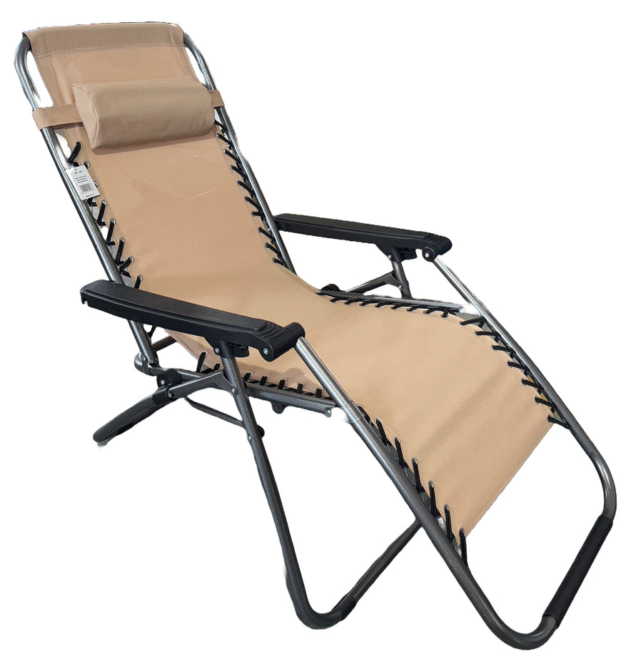 Struttura richiudibile con tubolare in acciaio verniciato Ø mm. 25, reclinabile a 180°, tessuto in textilene, poggiatesta.
