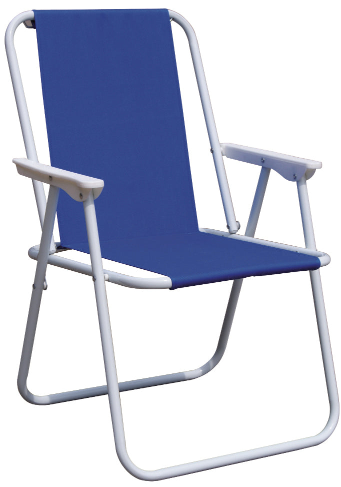 Struttura richiudibile con tubolare in acciaio Ø mm. 19, schienale alto, telo in poliestere, col. assortiti (blu, arancione, verde).