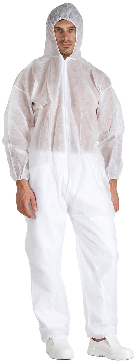 In polipropilene, traspirante, con cappuccio, polsi e caviglie elasticizzati, chiusura con cerniera.