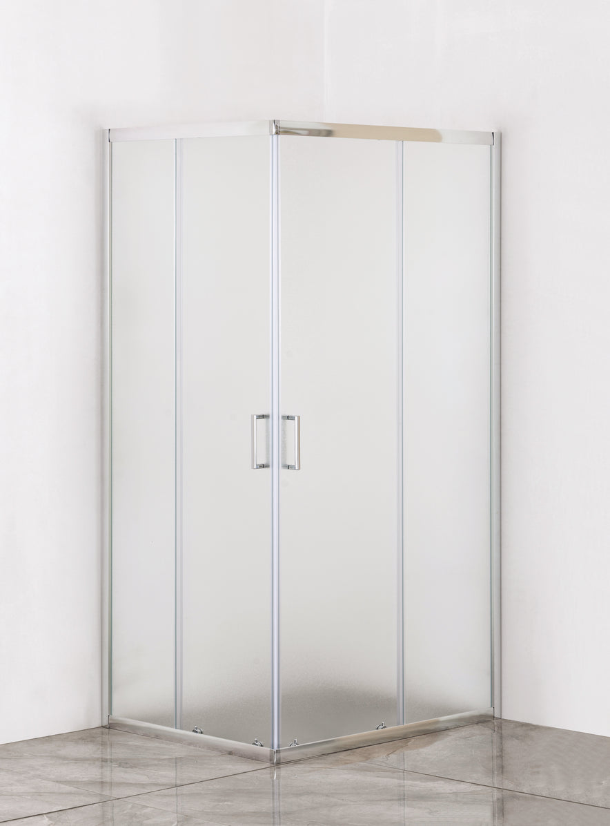 Profilo in alluminio cromato, profilo di compensazione cm. 1, pannelli in vetro temperato perlato spessore mm. 5, maniglia cromata, guarnizione magnetica waterproof, apertura scorrevole su rulli in ottone.