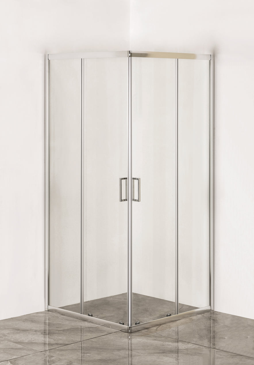 Profilo in alluminio cromato, profilo di compensazione cm. 1, pannelli in vetro temperato trasparente spessore mm. 5, maniglia cromata, guarnizione magnetica waterproof, apertura scorrevole su rulli in ottone.