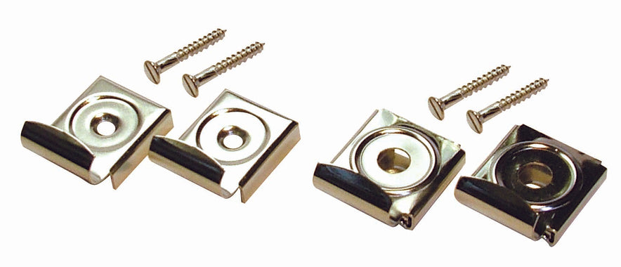 In ferro nichelato, completo di viti per il fissaggio. In blister da 2 coppie.
