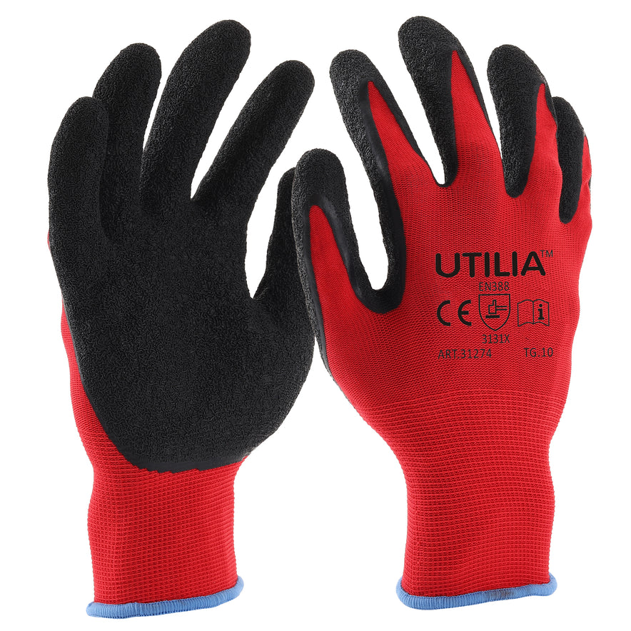 In nylon, con palmo e dita ricoperti in lattice, dorso aerato, polsino elasticizzato, col. rosso/nero.