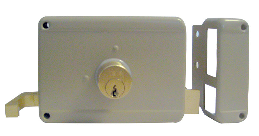 Serratura da applicare. 2 mandate e scrocco, cilindro esterno fisso e cilindro interno, 3 chiavi.